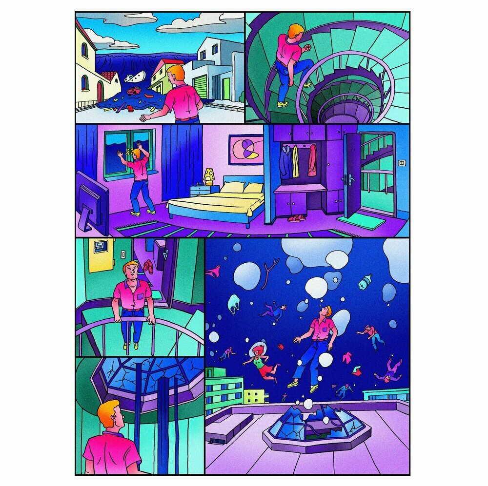 Privesc către tavanul de sticlă peste care apa trece și mă simt mic ca o furnică. Geamul se sparge și apa pătrunde în bloc. Aerul din mine mă împinge deasupra blocului unde privesc în sus către alte persoane plutind unde doar cu câteva minute înainte puteau zbura doar avioanele. Lumina soarelui răzbate prin apa cristalină și dezvăluie mulțimea de suflete pierdute...